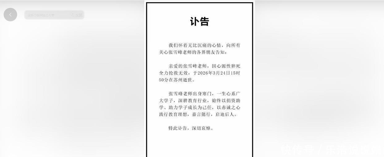 就在前一天,3月24日下午,苏州峰学蔚来教育科技有限公司发出了讣告,表示张雪峰因心源性猝死抢救无效去世,享年41岁。